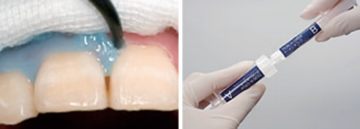 ティオン オフィスは過酸化水素を安全に歯面に作用させるための工夫がなされています。歯肉保護レジンはホワイトニングジェルの歯肉への付着を防ぎます。また、ホワイトニングジェルはシリンジAとシリンジBを接合してジェルを混合し、直接ディスポーザブルファイバー付きチップから塗布できるため、安全にお使いいただけます。